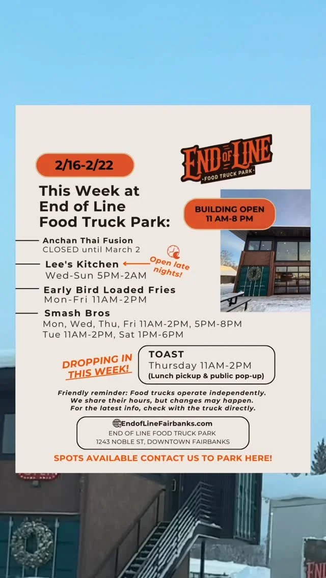 End of Line Fairbanks started as a vision to create a year round space for local food trucks, families, and friends to come together and enjoy delicious food in a family friendly environment.
