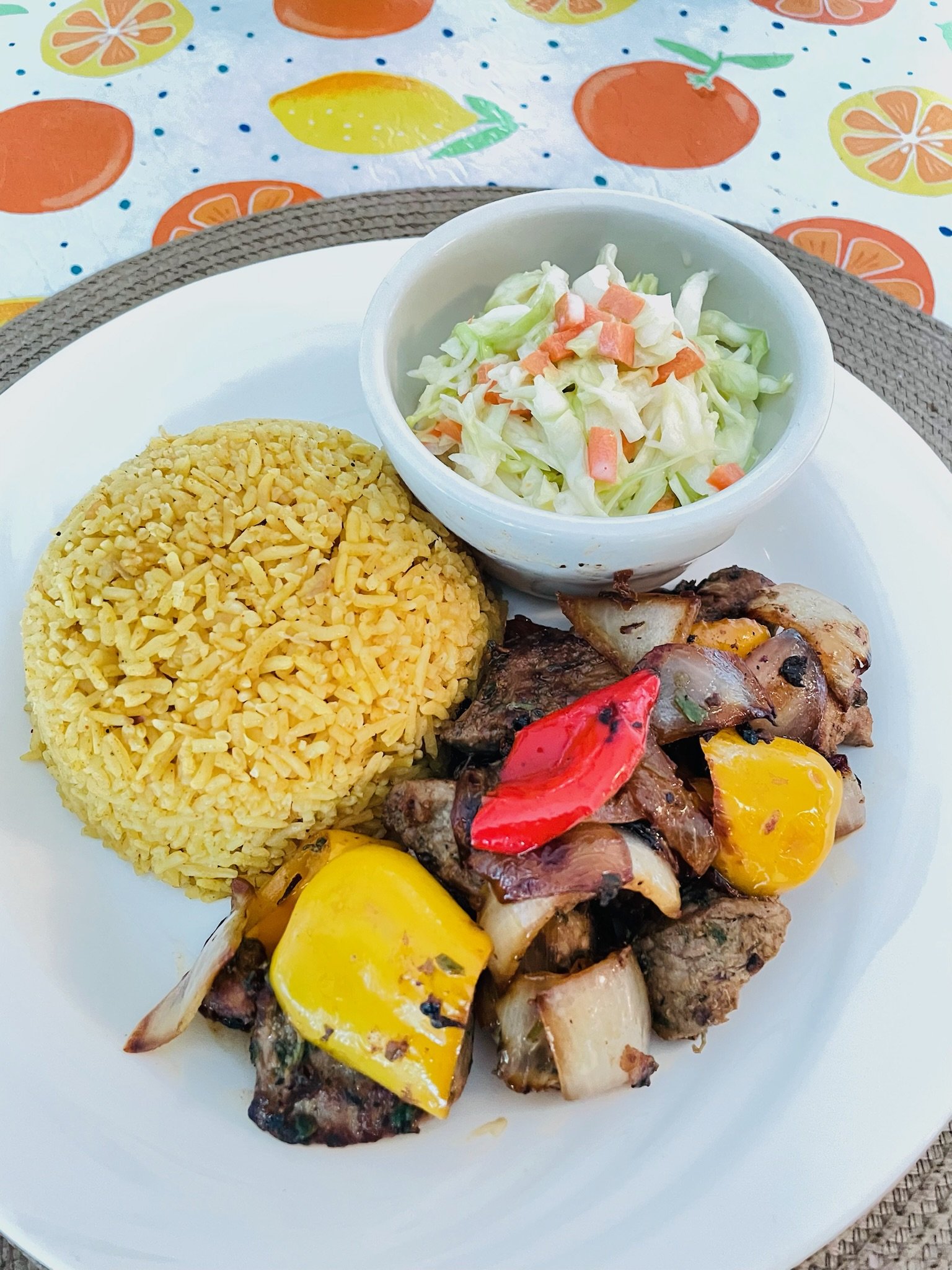 Biryani rice with lamb, and coleslaw